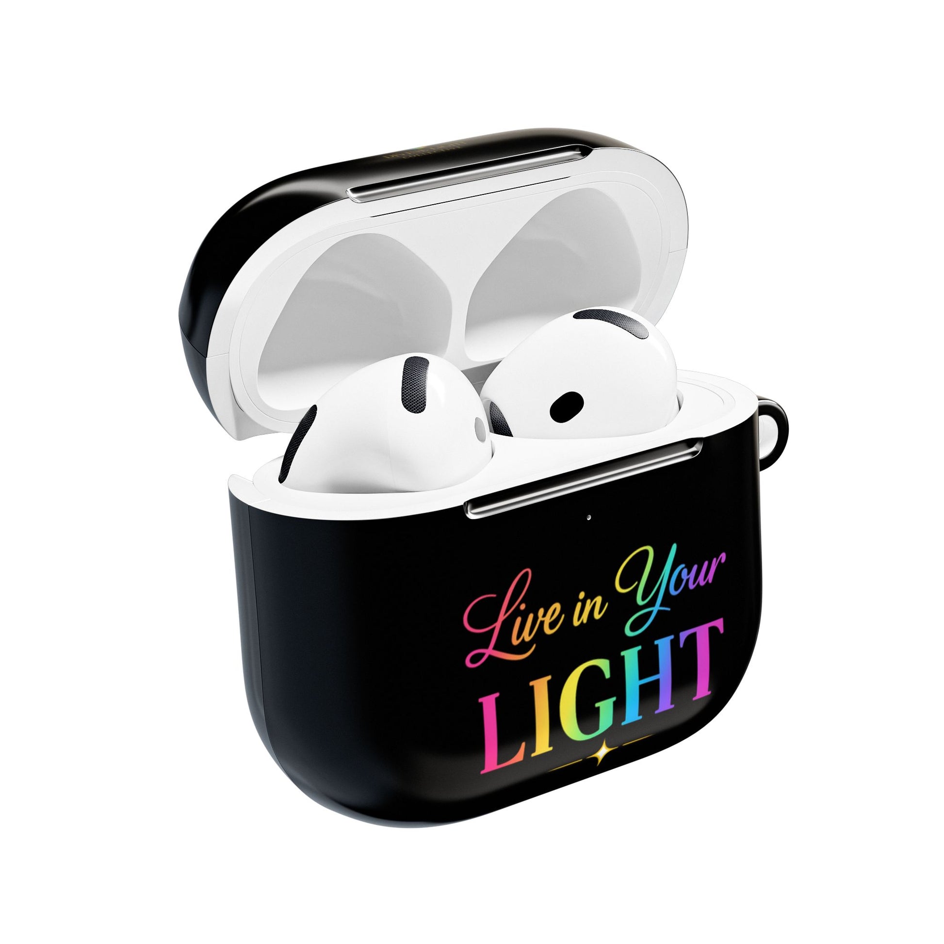A sleek, glossy polycarbonate AirPod case that carries a bright, uplifting message: “Live in Your LIGHT” in a rainbow gradient. The slim, lightweight shell protects your charging AirPods or AirPods Pro from everyday bumps and scratches while keeping the charging port accessible. A sturdy carabiner clip lets you attach the case to a bag or keys so your earbuds stay close during commutes, walks, or quick errands. Made in South Korea with durable, impact-resistant material and compliant manufacturing standards, this case blends everyday protection with a little burst of colorful inspiration—perfect for someone who likes tech that reflects their positive, radiant vibe.