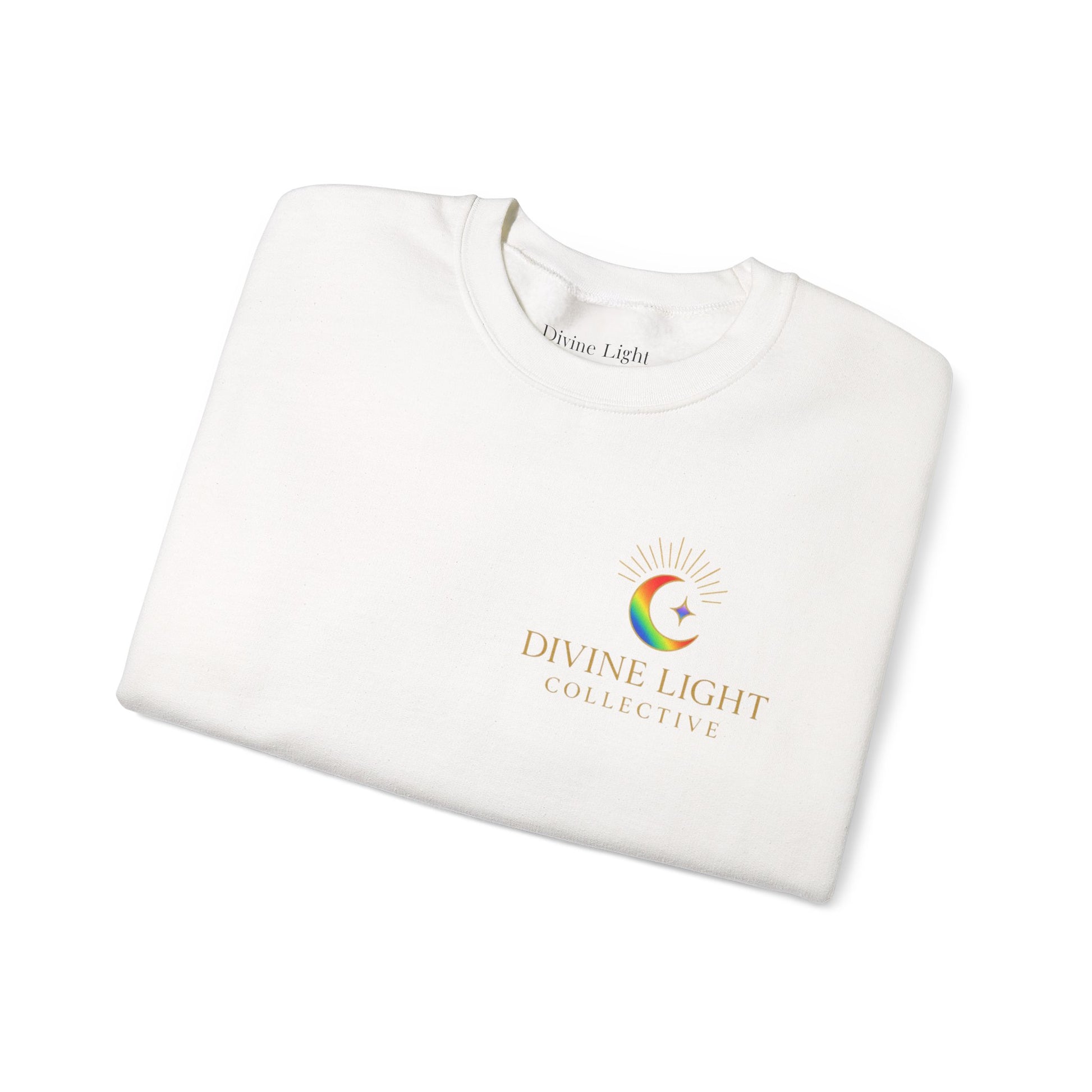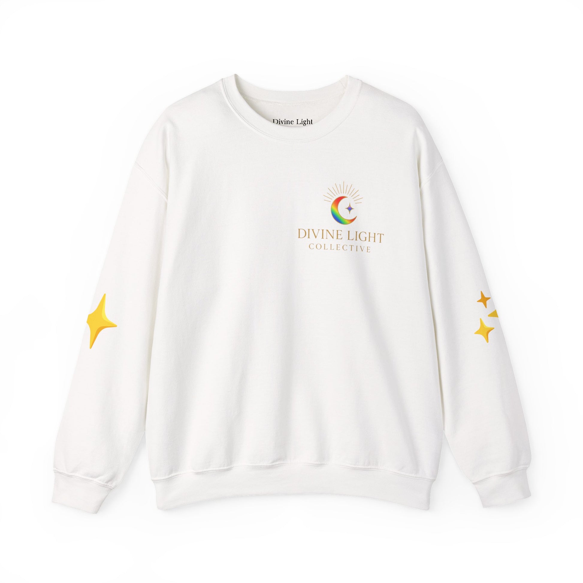 A soft, mid-weight crewneck that feels like a quiet sunrise wrapped around you. The clean white canvas puts gentle, rainbow-hued lettering front and back — a small crescent logo over the heart and a bold “Live in Your LIGHT” statement on the back — while gold star accents on both sleeves catch the eye as you move. Wear it on slow mornings with coffee, during evening walks when city lights start to glow, or layered for a cozy meet-up with friends. The fit sits true to classic crew proportions: roomy enough to lounge in, structured enough to layer under a coat. This sweatshirt appeals to people who collect small, meaningful reminders to stay luminous in everyday life and who appreciate thoughtful, wearable art that travels easily from home to casual outings.