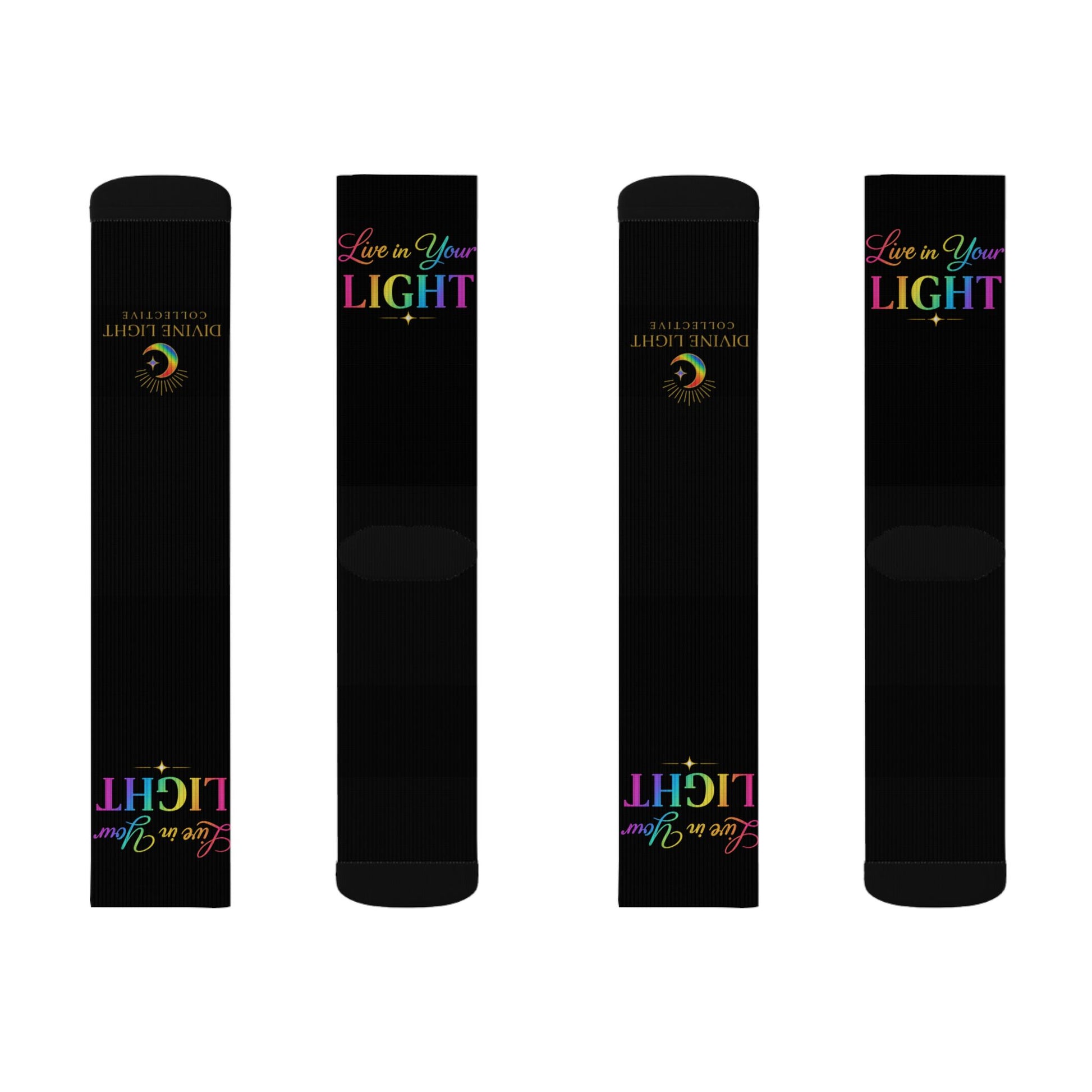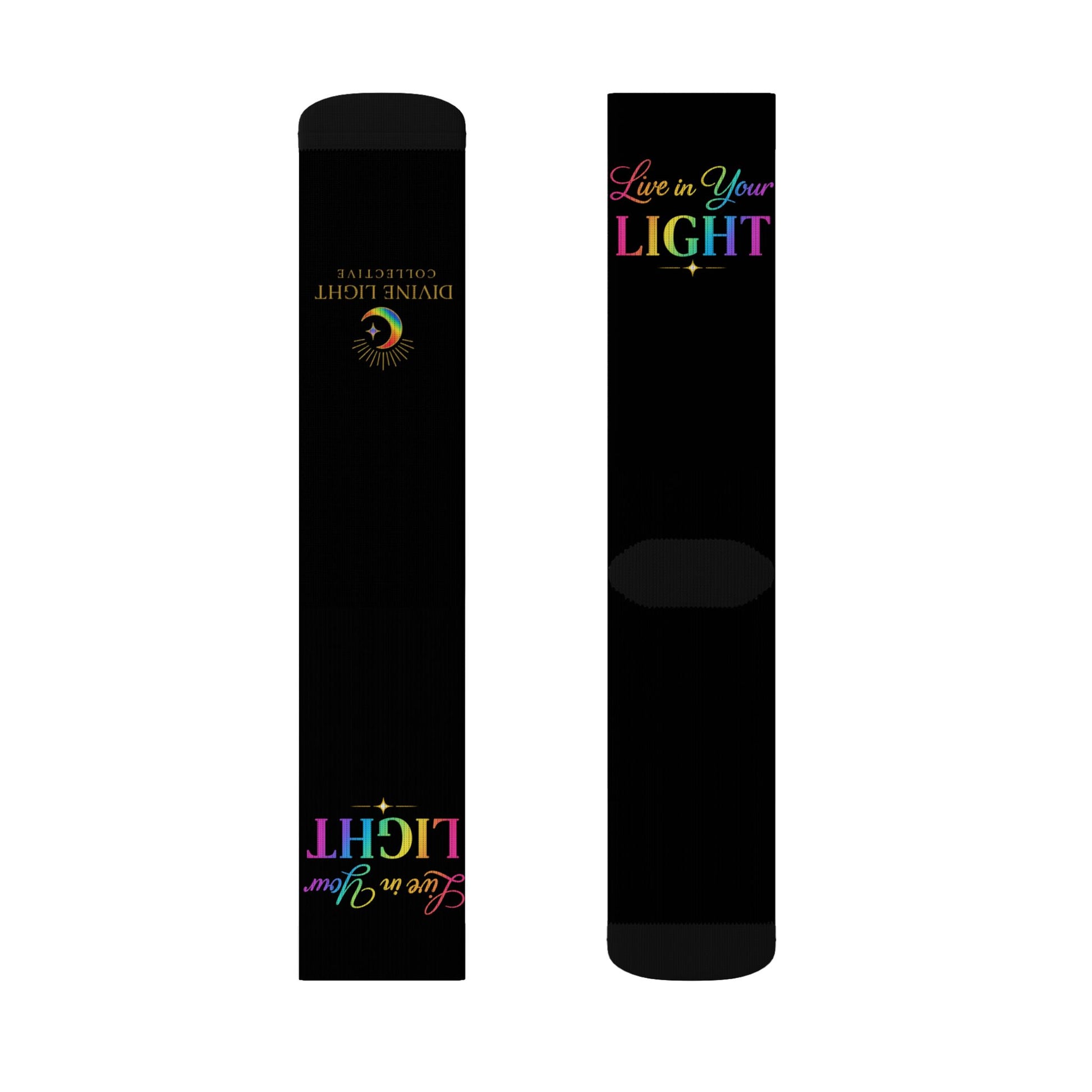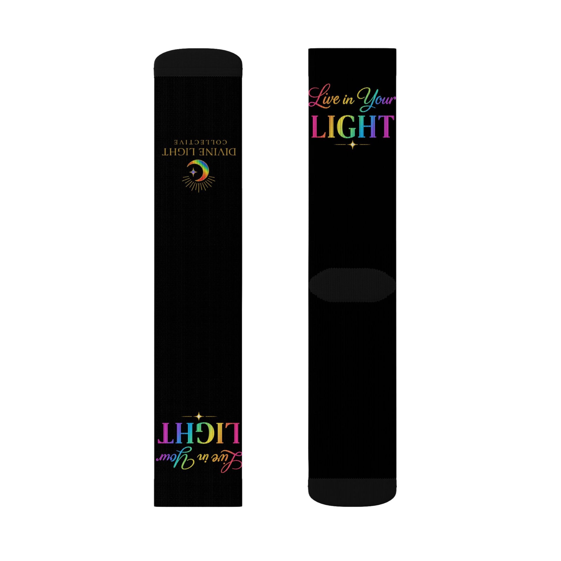 Inspirational 'Live in Your Light' Sublimation Socks — Rainbow Text Crew Socks
