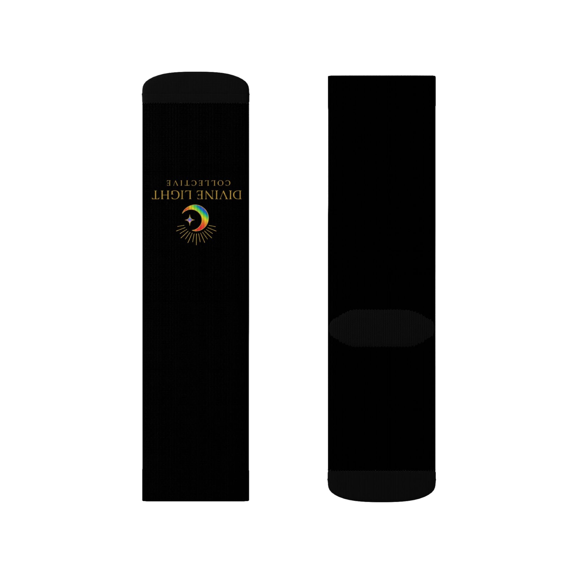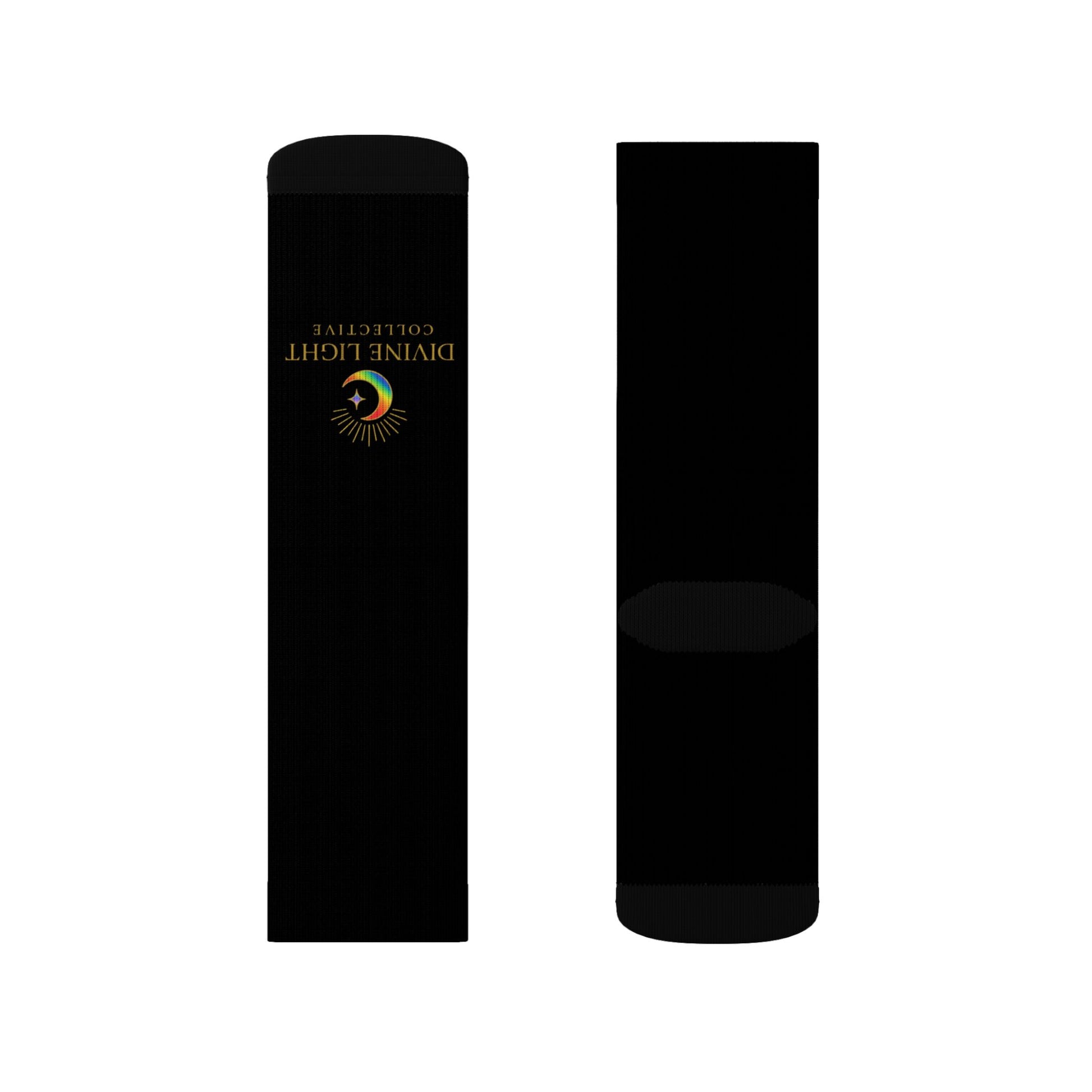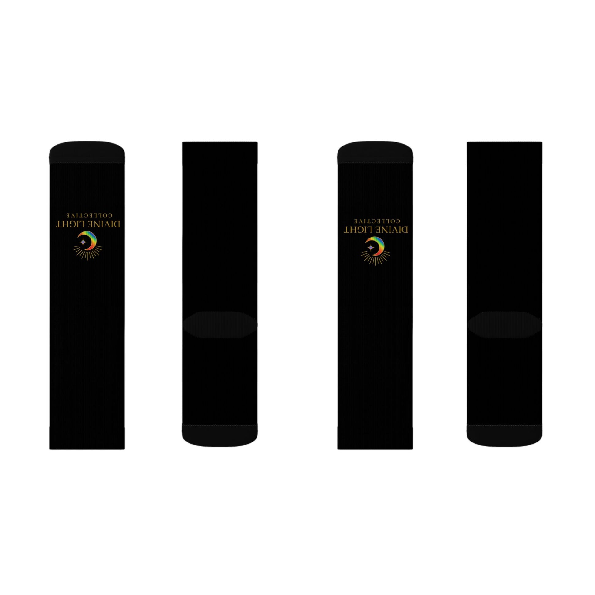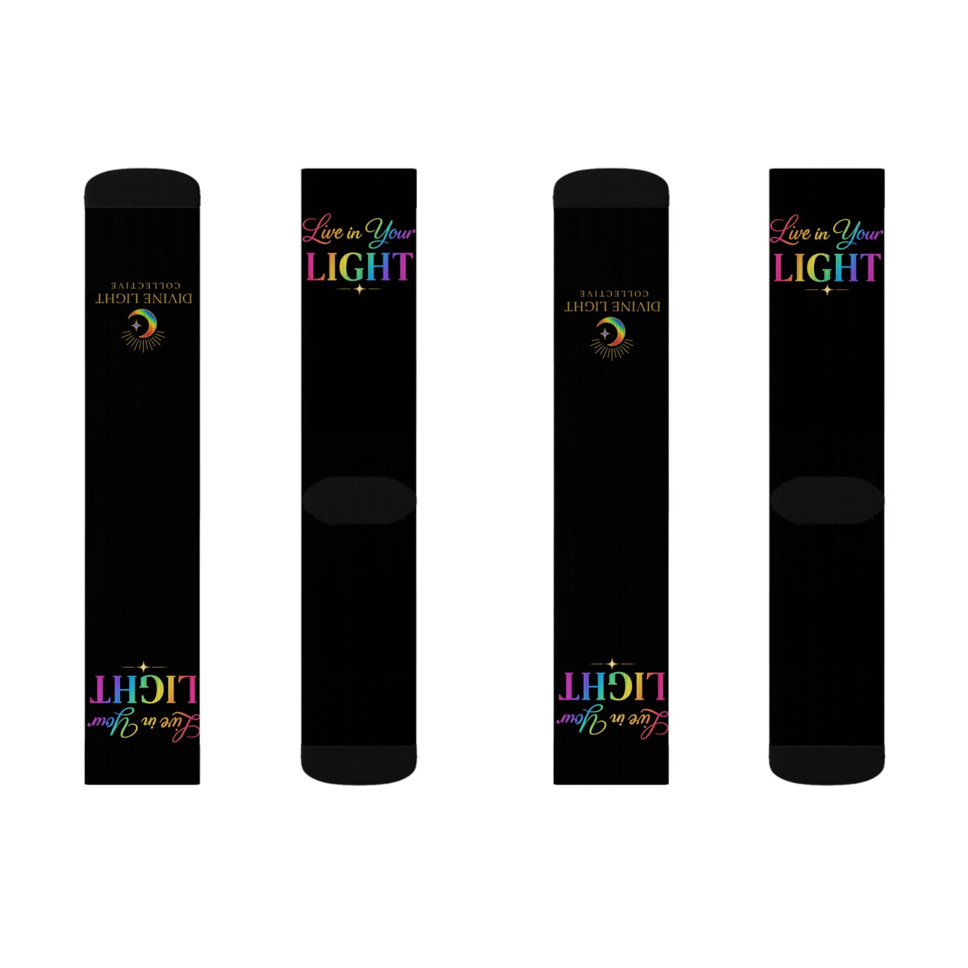 Inspirational 'Live in Your Light' Sublimation Socks — Rainbow Text Crew Socks