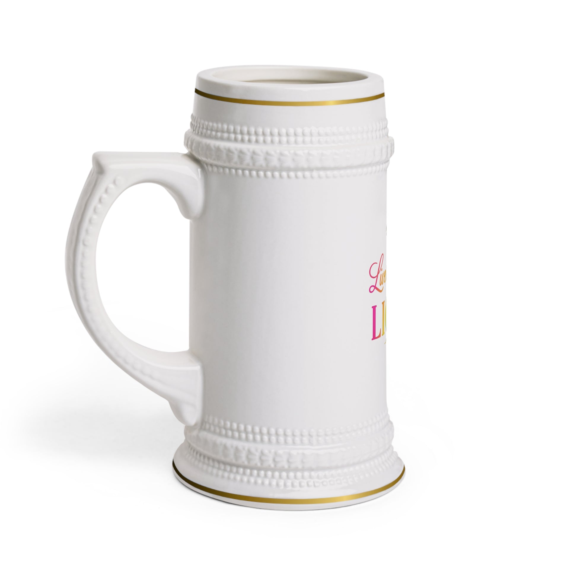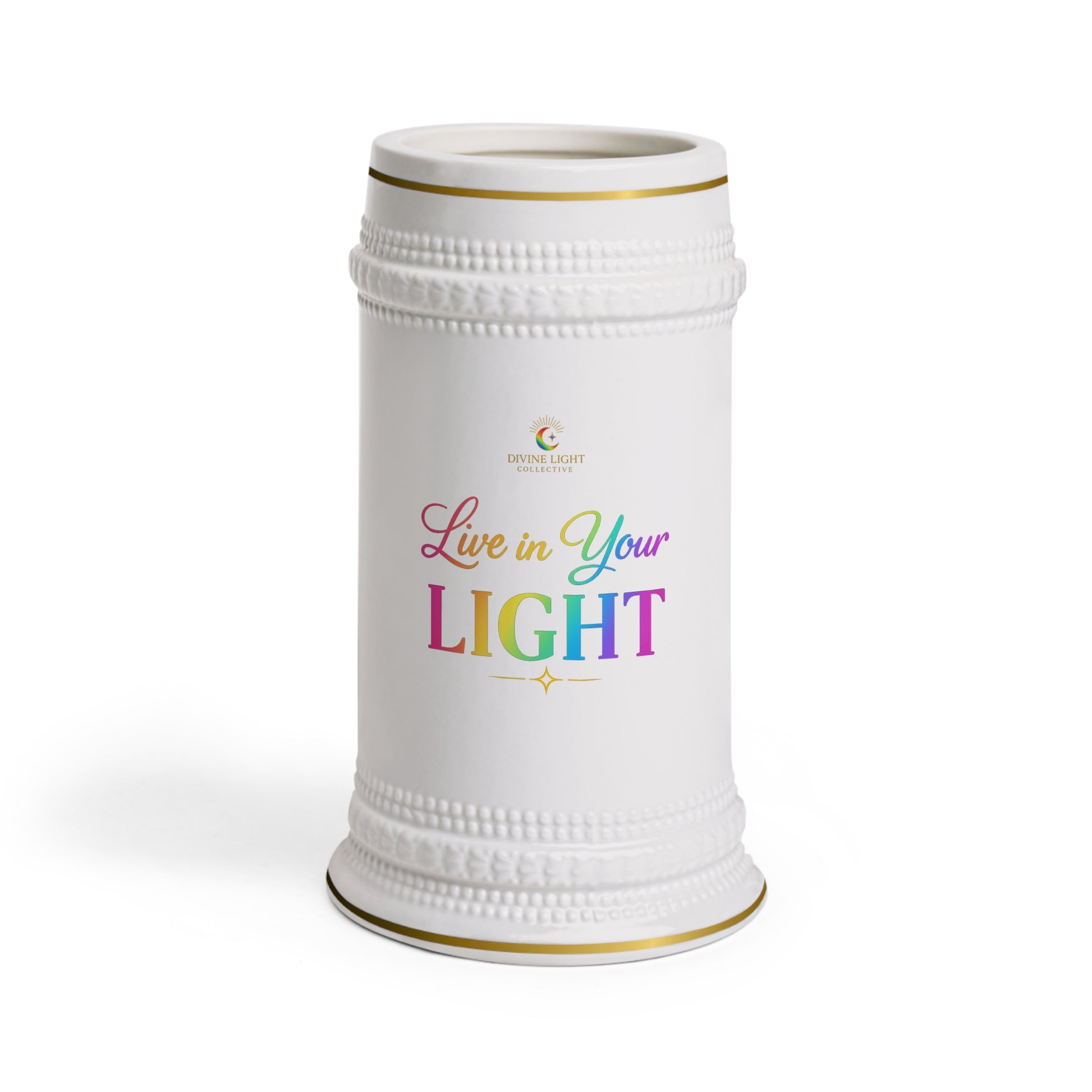 This glossy white ceramic stein brings bright, uplifting color to quiet mornings and celebratory toasts alike. Textured ribbed bands and a curved handled stein silhouette give it old‑world charm while the vibrant, high‑resolution print (“Live in Your LIGHT”) stays clear and scratch‑resistant through daily use. It warms quickly in the microwave and cleans easily in the dishwasher, so it moves from countertop display to hands‑on ritual without fuss. Use it for coffee, tea, or whatever you raise at the end of a long day — a cheerful reminder to live boldly and shine.