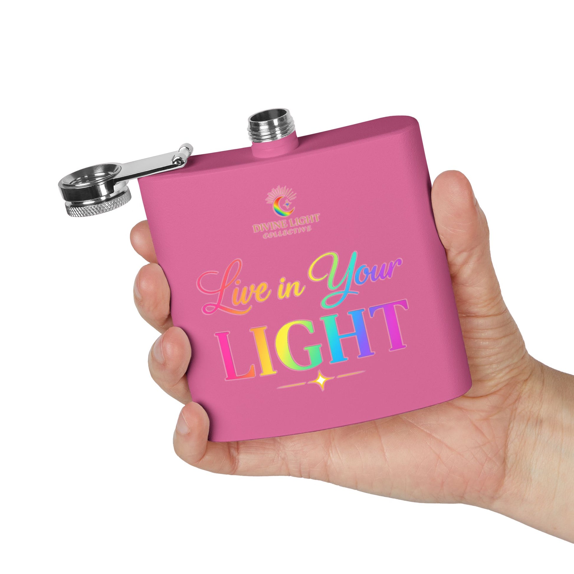 A compact 6oz stainless steel flask finished in a smooth powder coat and printed with a vibrant, UV DTF rainbow design that reads “Live in Your LIGHT.” Lightweight and leak-resistant, it slips easily into a pocket or small bag for on-the-go moments. Double-wall insulation keeps contents at a steady temperature, while the secure screw-top with attached latch prevents spills. Simple to care for — hand wash only — this flask blends durable everyday function with a bright, uplifting aesthetic that adds a personal touch to quiet celebrations or shared outings.